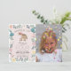 This cute "saddle up!" girl's birthday photo invitation card features a horse/pony with a pink ribbon/bow on a blush pink background surrounded by flowers and greeneries. The reverse side features a white background with handpainted check patterns in pink. Personalise it for your needs. You can find matching products at my store.