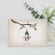An outdoors wedding r.s.v.p. featuring an illustration of a lantern filled with a pink flower arrangement hanging from a tree branch with green leaves.
