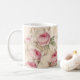 For your drinking morning coffee, evening tea, or something in between—this mug's for you! It's sturdy and glossy with a vivid print pink floral design that'll withstand the microwave and dishwasher.