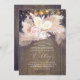 Blush pink flowers, pampas grass, string lights, and rustic wood background elegant exotic wedding invitations.