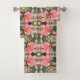 The pink floral pattern on this Towel Set was created from an original photograph of pink jatropha flowers and buds blooming in the garden. The closeup photo shows the yellow centre of the flower amid the pink petals. The green leaves of the flower on a beige background finish the pattern.