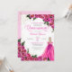 Quinceanera invitation in hot pink floral roses with gold accents and a girl with elegant ball gown. Check the shop for this invitation with girls in different hair colours and skin tones.