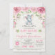Cute & girly baby shower invitation featuring an adorable watercolor elephant surrounded with blush pink flowers and green leaves