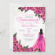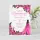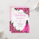 Quinceanera invitation in hot pink floral roses with gold accents and a girl with elegant ball gown. Check the shop for this invitation with girls in different hair colours and skin tones.