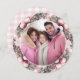 ROUND Rustic Pink Gingham Plaid Floral Holiday Photo Christmas Card featuring Cottagecore pink and pine elements with a soft pink gingham background. We've added the text Warm Winter Wishes and left space for your favourite photo and details. All colours and text can easily be customised! If you need assistance with the design or matching products, please contact us at katescreationszazzle@gmail.com.