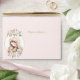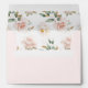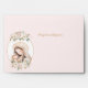 This elegant Catholic baptism invitation envelope in Spanish is perfect for the christening of a baby girl. It features an image of the Virgin Mary and Baby Jesus framed by beautiful white and pastel pink watercolor flowers and greenery with touches of faux gold foil leaves.
