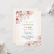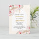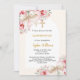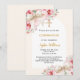 A white arch frame and soft beige, cream coloured background. Decorated with pink flowers and beige bows. A golden cross. Personalise and add a name and details.