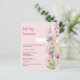 A blush pink background, with a large white cross decorated with pink and purple flowers. Personalise and add the name and details details.