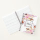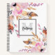 A chic white background with pink florals, roses, sprigs and brown, golden feathers. Summer boho, bohemian style. A grey and white frame with space for your name and monogram letter. The name is written in black with a modern hand lettered style script. Monogram letter in grey. Perfect for school, work, home office.