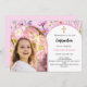 Add your own vertical size photo. A pink arch shaped photo frame. Decorated with pink flowers and a golden cross. Personalise and add a name and details.