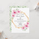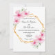 An elegant tropical summer wedding invitation. With a faux gold geometric frame decorated with light pink hibiscus, flowers tropical florals with some greenery. White background colour.