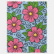 The design features large stylized flowers with rounded petals and a bright circular center. The flowers are drawn with thick black outlines that give them a clear, graphic look. Surrounding the flowers are smooth leaves with simple vein details, also outlined in black. Curved decorative lines and small dot-like shapes add a playful, flowing feeling to the design. The color palette includes strong pink for the flowers, fresh green for the leaves, warm yellow for the centers, and a calm light blue background. The contrast between the bold outlines and flat colors creates a lively and cheerful visual style with a slightly whimsical character.
