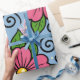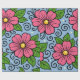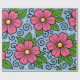 The design features large stylized flowers with rounded petals and a bright circular center. The flowers are drawn with thick black outlines that give them a clear, graphic look. Surrounding the flowers are smooth leaves with simple vein details, also outlined in black. Curved decorative lines and small dot-like shapes add a playful, flowing feeling to the design. The color palette includes strong pink for the flowers, fresh green for the leaves, warm yellow for the centers, and a calm light blue background. The contrast between the bold outlines and flat colors creates a lively and cheerful visual style with a slightly whimsical character.