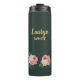 Pink flower and leaves on dark green thermal tumbler