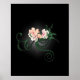 A poster with an illustration of some delicate pink blossoming flowers with green swirlies and leaves on a black background with some light grey shading around the flowers to accentuate and illuminate.