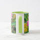 This floral mug features my original photograph of pink Zinnia flowers in a garden. I processed my photograph with an oil pastel painterly style for an artsy flair. The handle and inside of the cup are a light green to complement the artwork.