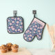 Stylish women's oven mitt and pot holder set in a stunning pattern of pink flowers and green leaves on a clean blue background emphasizes timeless elegance. Personalise by adding your name.