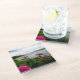 This glass coaster displays photography of bright blossoming pink flowers reaching up from the leaves and contrasting beautifully against the water behind.