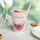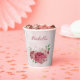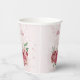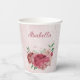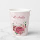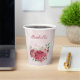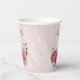 Beautiful romantic paper cup featuring pink and dusty rose flowers and some green leaves .