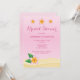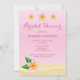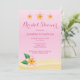 Tropical bridal shower invitation card featuring Destei's illustrated pink and orange colour frangipani plumeria flowers in beach themed setting. The background colour is pink and the bottom of the card has sand texture. Personalise the text areas with the details of your event.