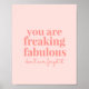 Several shades of muted coral pink inspirational quote poster print for your wall with "you are freaking fabulous, don't ever forget it!" makes a great uplifting self-confidence statement in an office, room, or apartment. Background colour can be changed to match your decor, as well as the script font wording to create your own freaking fabulous mood booster poster.