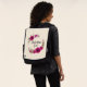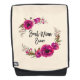 A backpack with the text: Best Mum Ever. Designed with pretty fuchsia pink poppies and decorative sprigs and leaves in a circular floral wreath. Pretty and elegant and created using watercolors.