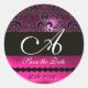 PINK FUCHSIA PURPLE DAMASK MONOGRAM, violet Classic Round Sticker