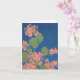 A notecard with a screenprinted design of salmon pink geraniums on a deep blue background. Left blank inside for your own message.