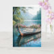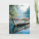 A wooden rowboat with vibrant pink flowers drifts peacefully on a serene lake surrounded by lush greenery and distant mountains.
