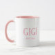 Gigi coffee mug design with established year featuring a pink stamped font set on a white background. Click customise to edit the background colour!. Visit our shop to view this mug in a large assortment of grandfather names.