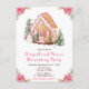 This elegant and festive gingerbread house decorating party invitation features a watercolor gingerbread house and beautiful pink poinsettia flowers. The text combines handwritten script and sans serif fonts for a stylish and modern look. The snowman, decorated pine trees and holiday wreath add a festive touch. This is perfect for Christmas parties.