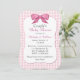 Stylish couple's bracket shaped baby shower invitation done in a light pink and white gingham checked pattern. Graphics of a pink outlined white text area, in the middle, has a pretty rose pink bow, at the top. The backside is done in the same gingham pattern. Personalise all the text to suit your event needs.