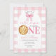 Celebrate your sweet girl’s first birthday with this charming pink “Cutie Pie” invitation featuring a soft gingham background, watercolor pie illustration, and a delicate satin bow accent.