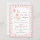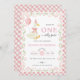 Celebrate your baby’s first birthday with a whimsical and heartwarming invitation! Featuring a cute white goose with a party hat and pink bow, floating against a soft background. The design is framed with a pink gingham border, decorated with ribbons, green leaves, and pink flowers—perfect for a cheerful party vibe!