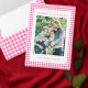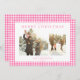 Create your own custom photo Christmas cards featuring two of your family pictures alongside personalized minimalist typography name and year on a cute pink gingham plaid pattern background.