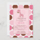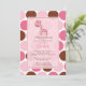 Adorable Baby Shower invitation featuring a pink giraffe set on a brown & pink polka dot background. Matching items available in our shop. Perfect for a baby girl baby shower. ©Stockberry Studio