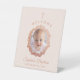 Pink Girl Baptism Photo in Rose Gold Floral Wreath Pedestal Sign