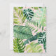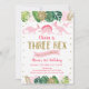 This adorable birthday invitation features tropical watercolor leaves with gold glitter leaf embellishments and pink dinosaurs.