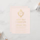 This elegant pink and gold first communion invitation with a vintage air, recommended for a girl, has a vintage floral crest with a cross in it, in faux gold foil. The name of the girl is written in an elegant calligraphic script. All text can be personalised and has a golden colour similar to the faux gold crest. The background is blush pink.