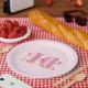 Paper plates with a glitzy shiny bow with gold outline and a faceted pink gemstone in the centre. Feminine luxury glam style.