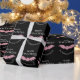 This custom gift wrapping paper features a cute Halloween theme. The background is black, with a pink glitter bat in the centre of the text area. The phrase "Happy Halloween" is printed at the top in a whimsical font. A sample family name is printed at the bottom which your can personalise to include your own custom name or text.
