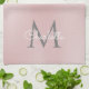 Pretty girly pink glitter drips, elegant script name, and grey monogram on a blush pink background kitchen towel. Designed by Thisisnotme©