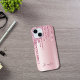 An elegant, girly and glam phone case. Blush pink background and faux glitter drip, paint dripping look. Insert your name, written with a modern hand lettered style script. Dark rose gold coloured letters.