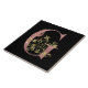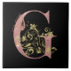 Pretty pink glitter initial / letter G with gold leaves and swirls and coppery butterfly overlay on black background