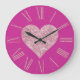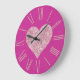 This glamourous and girly wall clock features a bright fuchsia background with a faux pink glitter heart in the centre. The hours are printed in a pink glitter Roman numeral design.