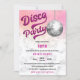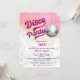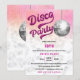 © Socialite Designs Inc. & LICENSORS. Celebrate a disco birthday party by inviting the guests with this fun, retro disco birthday party invitation. Colours are silver, white, hot pink glitter and grey. The design incorporates a silver disco ball and white string lights, with bokeh as a background.