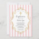 Confirmation invitation featuring a pink & white stripe background with a gold cross & frame for a girls confirmation