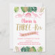 This adorable birthday invitation features tropical watercolor leaves with gold glitter leaf embellishments and pink dinosaurs.