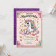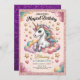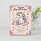 Make your little girl's birthday truly magical with this adorable unicorn-themed party invitation! Featuring a charming unicorn with a rainbow mane sitting on fluffy clouds, surrounded by golden stars and hearts, this design is perfect for celebrating a 4th birthday. With pink glitter borders and whimsical pastel elements, it's sure to delight guests and set the tone for a fun, fantasy-filled party.