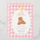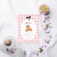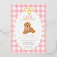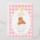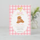 Planning a girl’s golden doodle first birthday? This editable foiled pink and yellow gingham invite showcases a hand drawn golden doodle doggy, sweet foiled scallop border and bow, and the phrase “One Golden Year.” Set the perfect tone for a tail wagging celebration they’ll never forget.